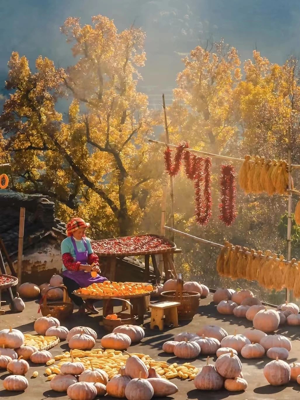 如今,这一习俗已演变成一场震撼视觉的“大地艺术”:火红的辣椒、金黄的皇菊、橙红的柿子铺展在徽派民居的晒匾里,与粉墙黛瓦相映成趣,绘就四季变换的流动画卷。