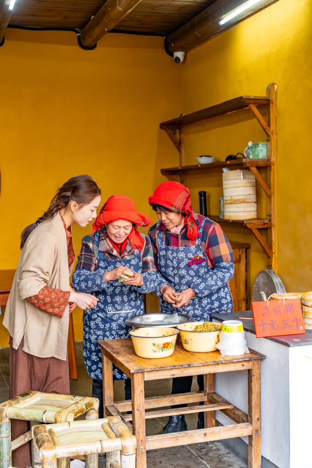 除了花海盛景,篁岭古村也藏着诸多惊喜。而古村真正的魅力,便藏在那些需要慢下来才能发现的细节里。推开虚掩的木门,或许能撞见阿婆在包清明粿;转过弯,晒秋人家阳台上,红辣椒与黄玉米散发着岁月香气。无需刻意讲解,陌生的农具和食材会吸引孩子的目光,这里也由此成为一堂生动的乡土课堂。
