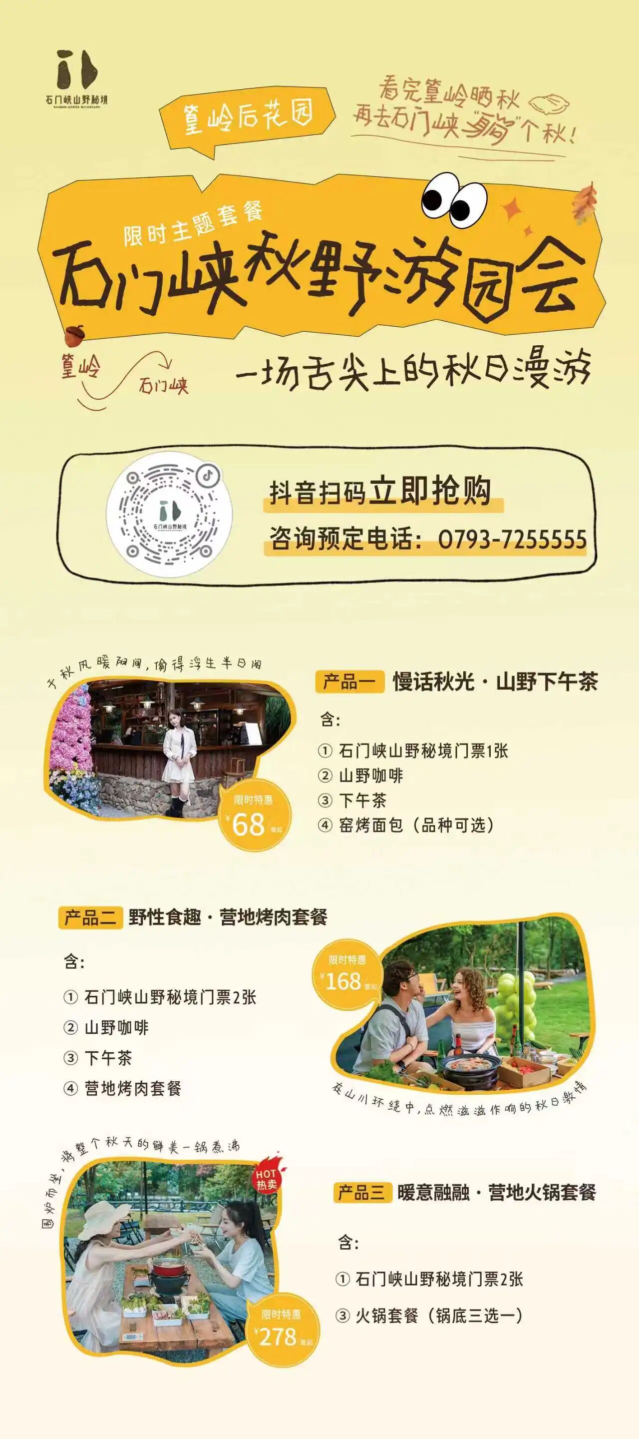这个秋天,来篁岭晒个秋,更要去石门峡“躺”个秋!秋野游园会特惠套餐68元起,赶紧抢购锁定这份惬意,让慢时光治愈所有疲惫~