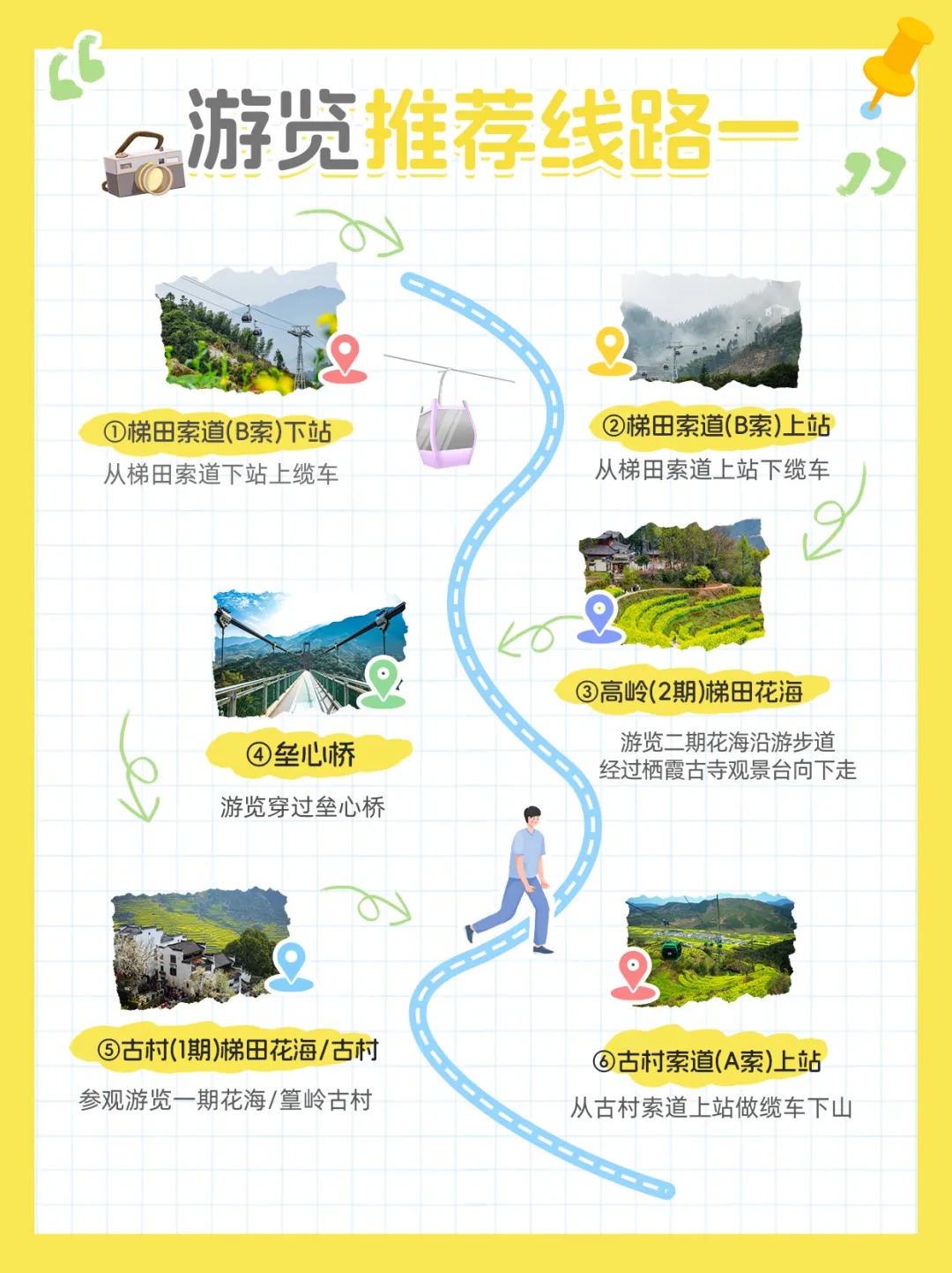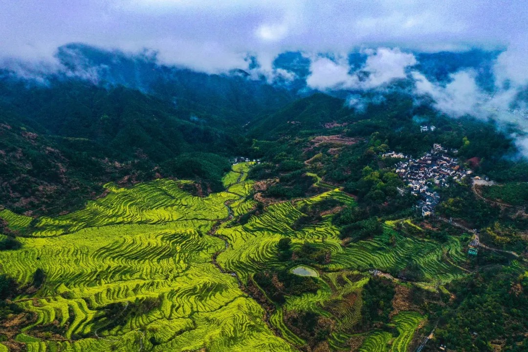 下索道直达最佳观景位,此处可览整片高岭梯田油菜花,金黄花浪与远山云雾交融,还能远眺一期古村花海与徽派村落相融之景,随手一拍就能出片。