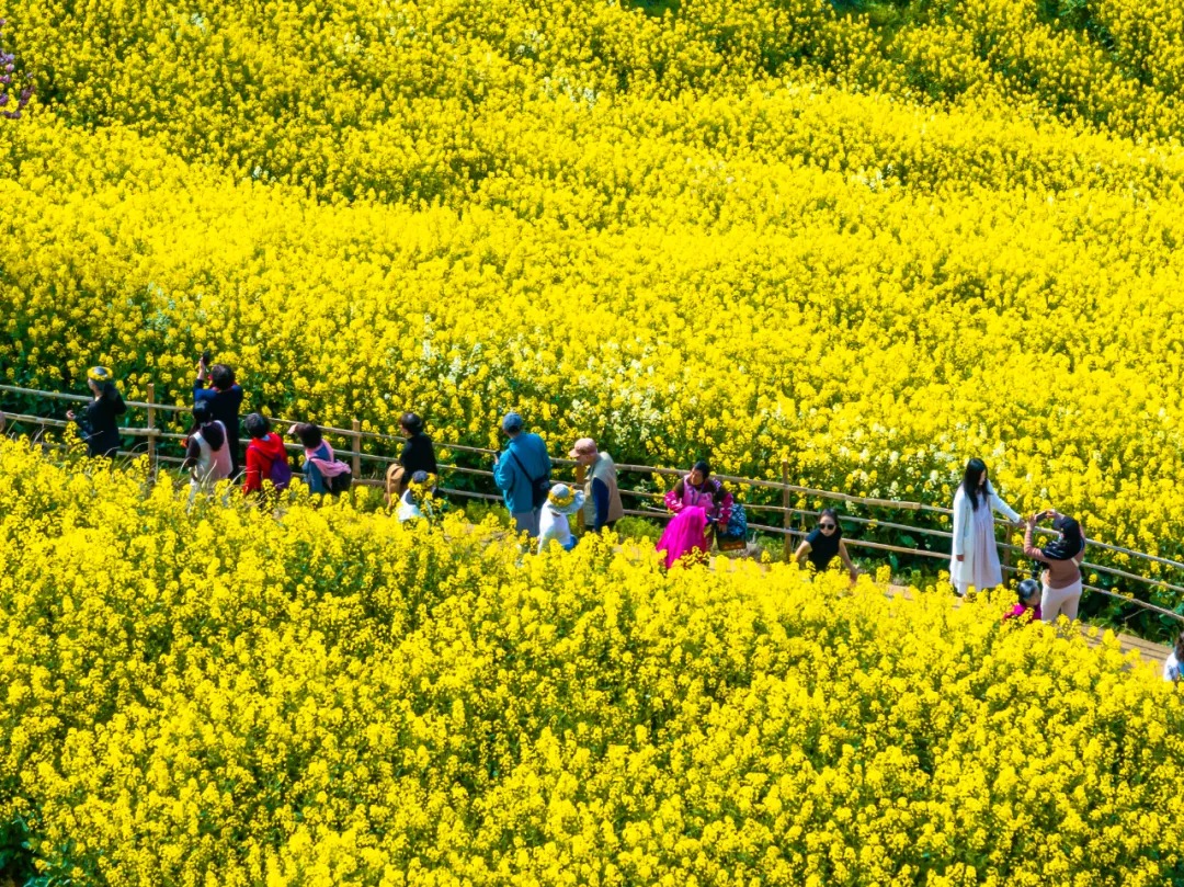 最先闯入视野的,是山下平原油菜花铺就的金色海洋。如今这片花海正处于100%盛放的最佳状态,公路两旁,绵延的花田顺着平坦的地势铺向远方,风一吹,便翻起层层叠叠的金色波浪,阳光洒在花瓣上,每一朵都闪着细碎的柔光。