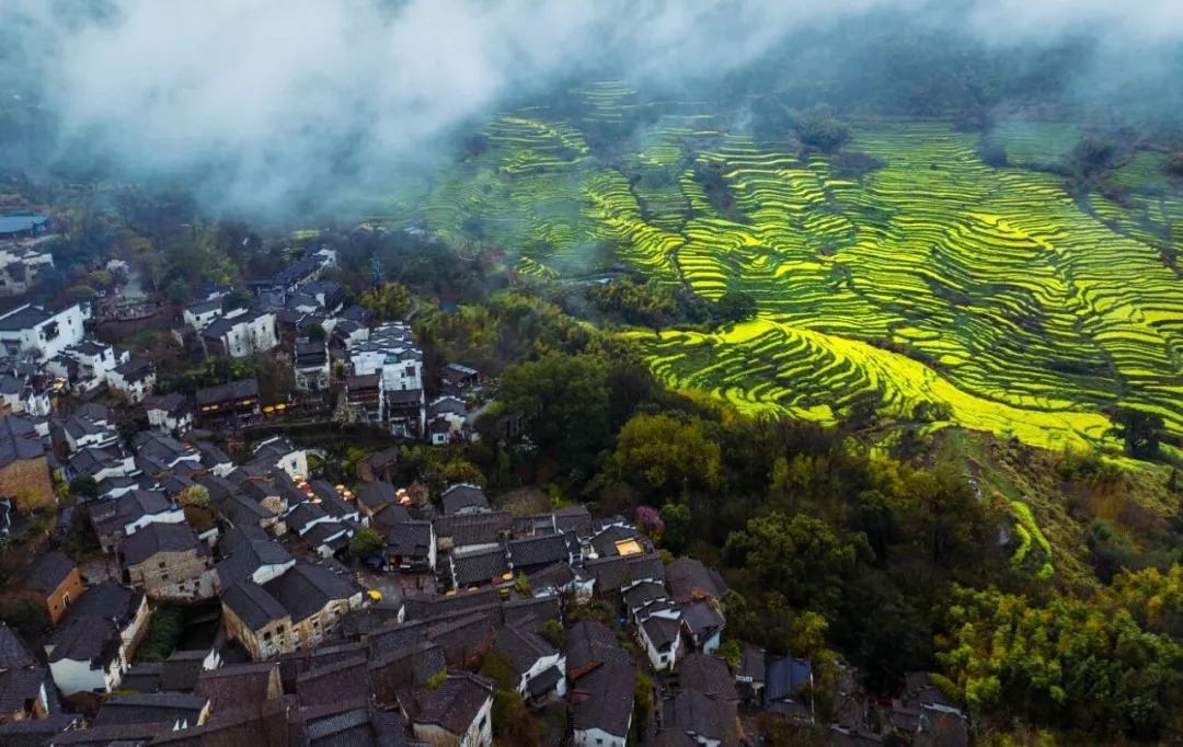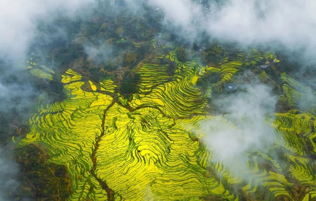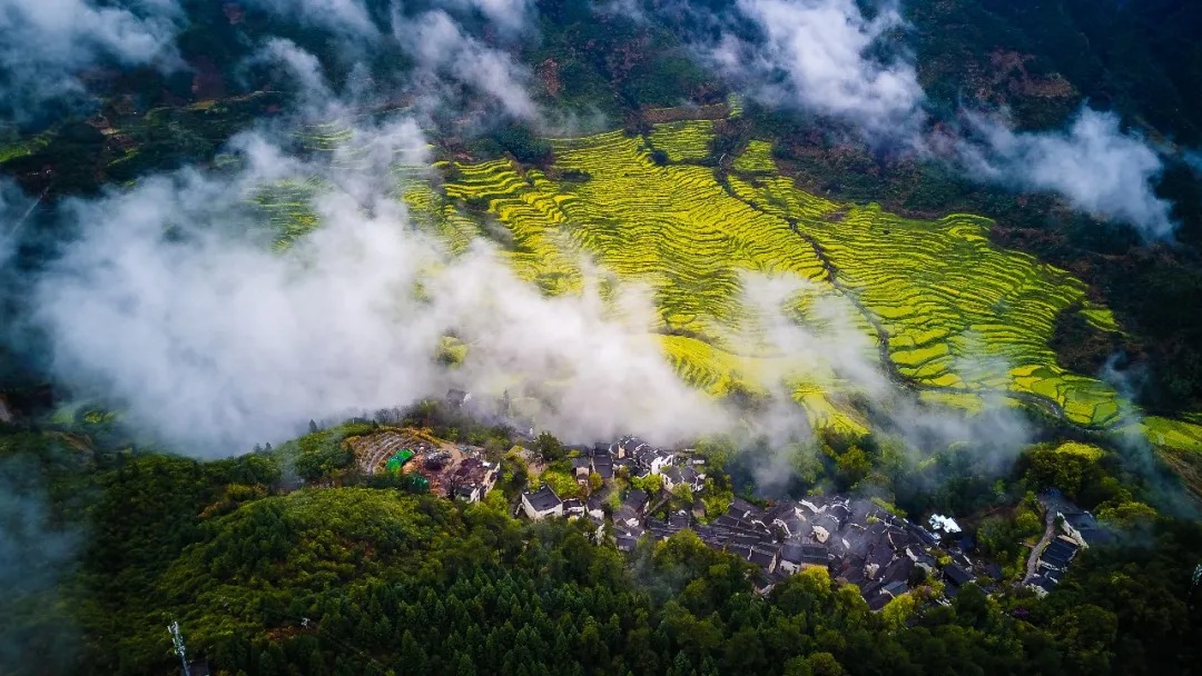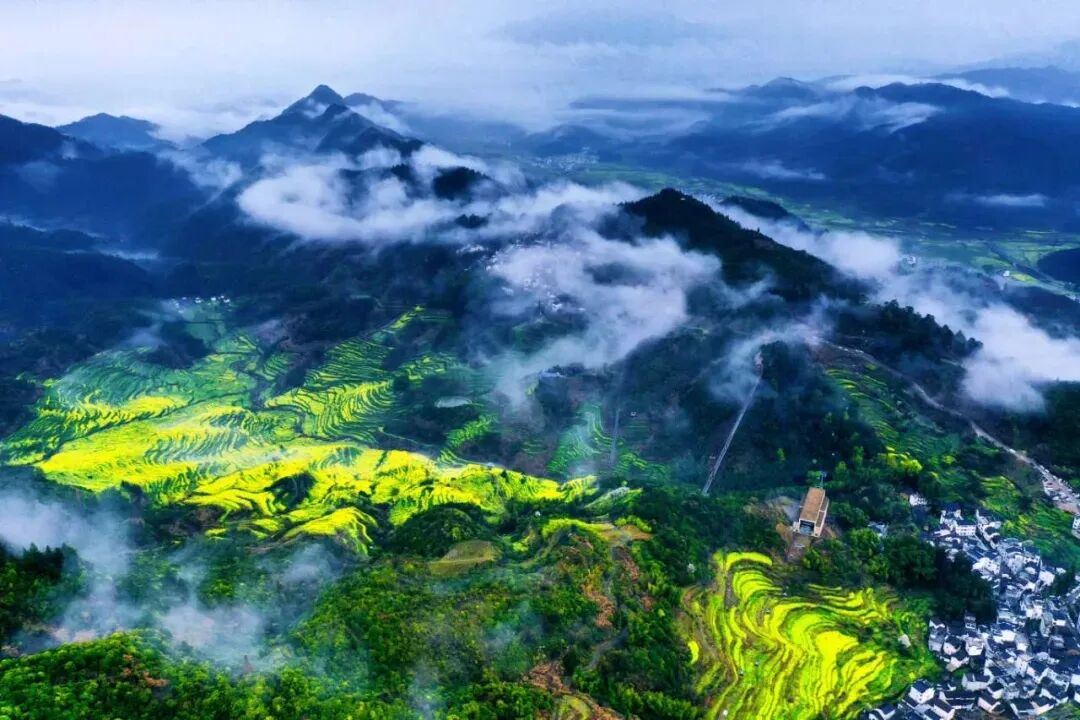 很多人总觉得,赏花要趁晴光正好,却不知春雨浸润的篁岭,藏着江南春日最绝的水墨意境。近来连绵的春雨,给这片山野蒙上了一层柔美的滤镜,山间漫起轻薄的云雾,万亩金色花海在烟雨中若隐若现,层层叠叠的梯田顺着山势起伏,粉墙黛瓦的徽派古村半藏在云雾间,像一幅刚落笔的水墨丹青,每一眼都透着仙气。