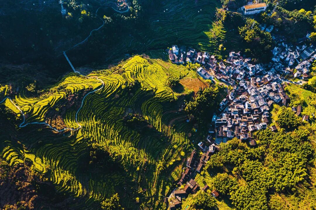 顺着山势往上,便是与徽派古村相依的古村一期梯田花海,如今也已全然开透,进入了颜值巅峰期。层层叠叠的梯田顺着山崖蜿蜒铺展,金黄的油菜花顺着田垄次第绽放,像给青黛色的山体镶上了层层金边。