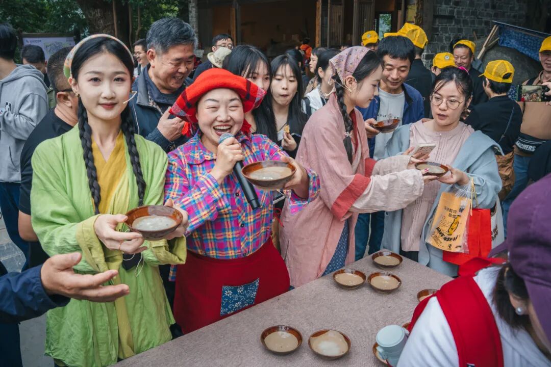 在篁岭,秋色不只在眼里,更在体验中。这里保留着许多充满烟火气的乡愁民俗。才到村口,便有身着传统服饰的村姑们,端着香甜的自家酿米酒,笑盈盈地拦在门前。下午,邂逅一场清雅的“茶舞迎宾”采茶姑娘们随着悠扬的乐声翩翩起舞
