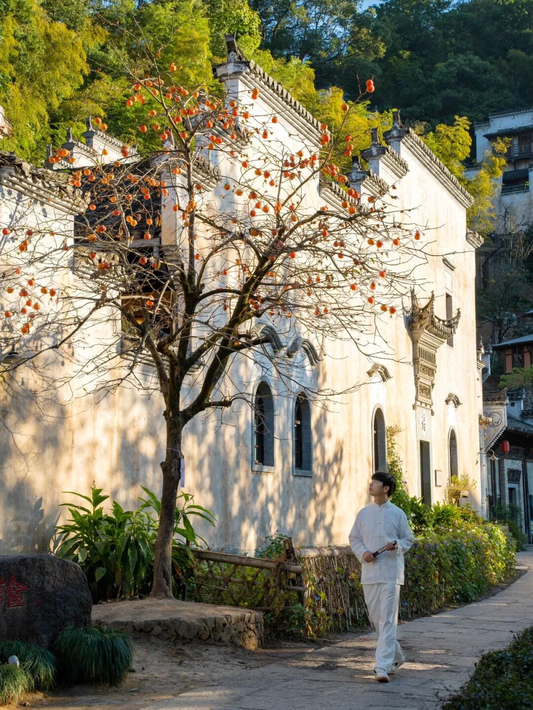 竹山书院的门口,有一棵秋意满满的柿子树,暖秋的柿子最是多彩,橙的圆润、红的透亮,为古朴的书院增添了几分秋日浪漫。