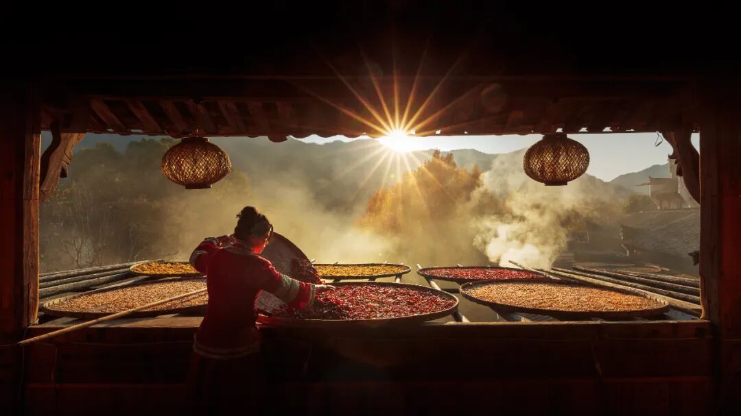 作为爆火的打卡点,晒工坊的三层结构各有特色。一层可近距离观察村民晾晒皇菊等作物的过程,金黄的皇菊铺满竹匾,治愈又耀眼;二层窗台边常挂着串成串的红辣椒,色彩浓烈;三层观景台视野开阔,能看见整个村落,怎么拍都经典。