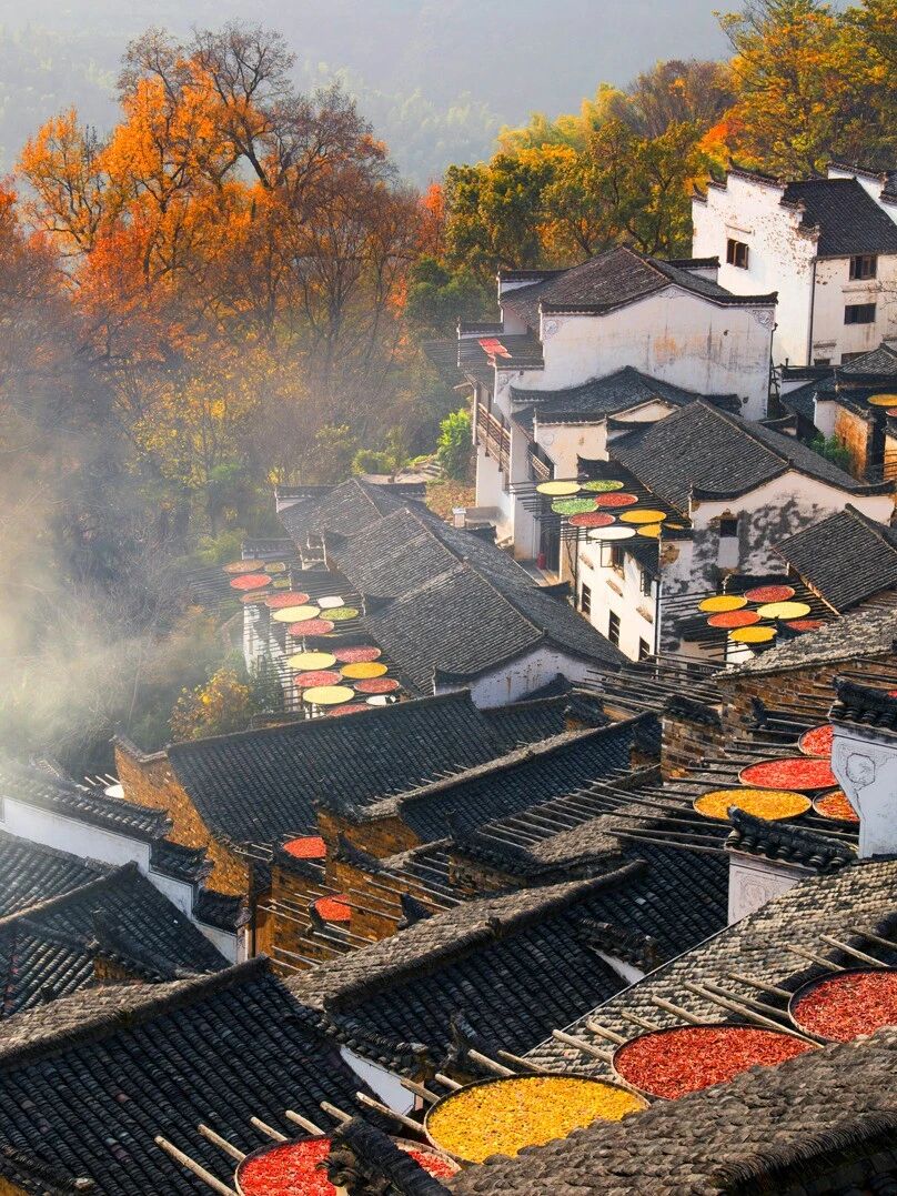 秋日篁岭裹着徽州古韵,红枫映白墙、金柿缀黛瓦,晒秋竹匾错落成景,人文底蕴与秋日风光相融,适配研学求知、会务欢聚等多元场景,让每段行程都藏着温暖质感。