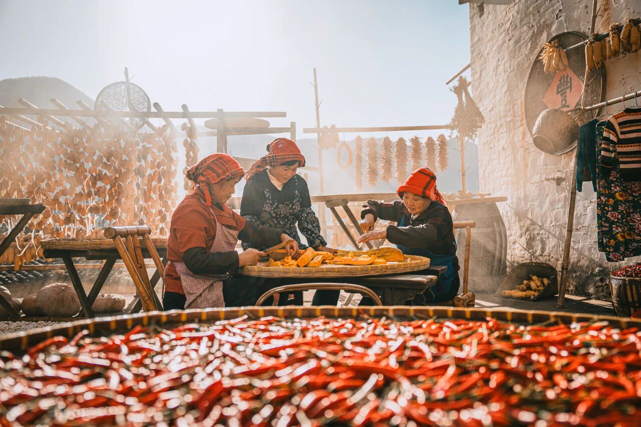 晨雾渐散时,炊烟从黛瓦间袅袅升起,轻缠漫绕着枝头红叶,晕开朦胧的诗意。晒秋架上,红辣椒串垂挂如焰,黄玉米、金南瓜铺展成锦黄得明亮