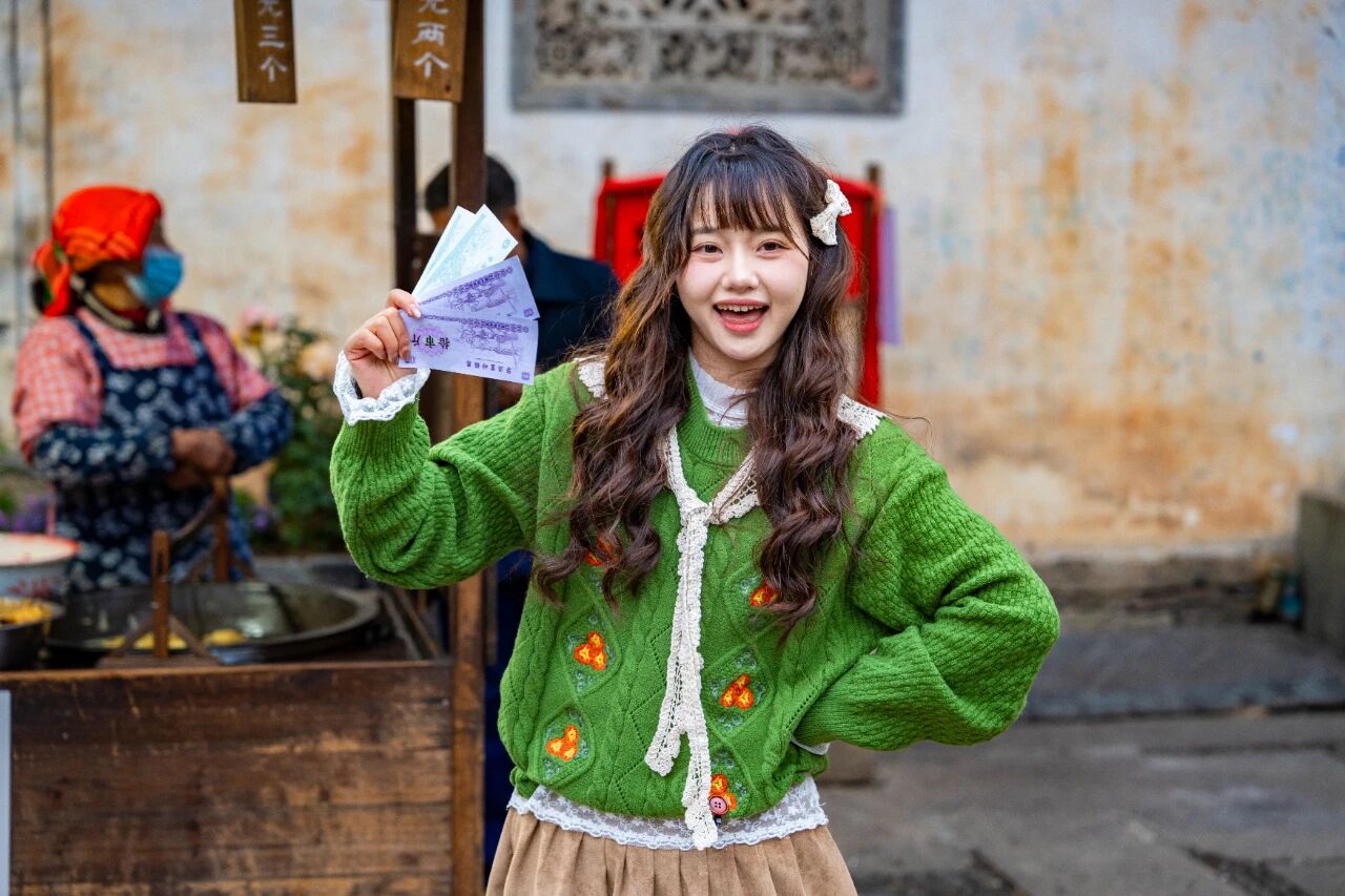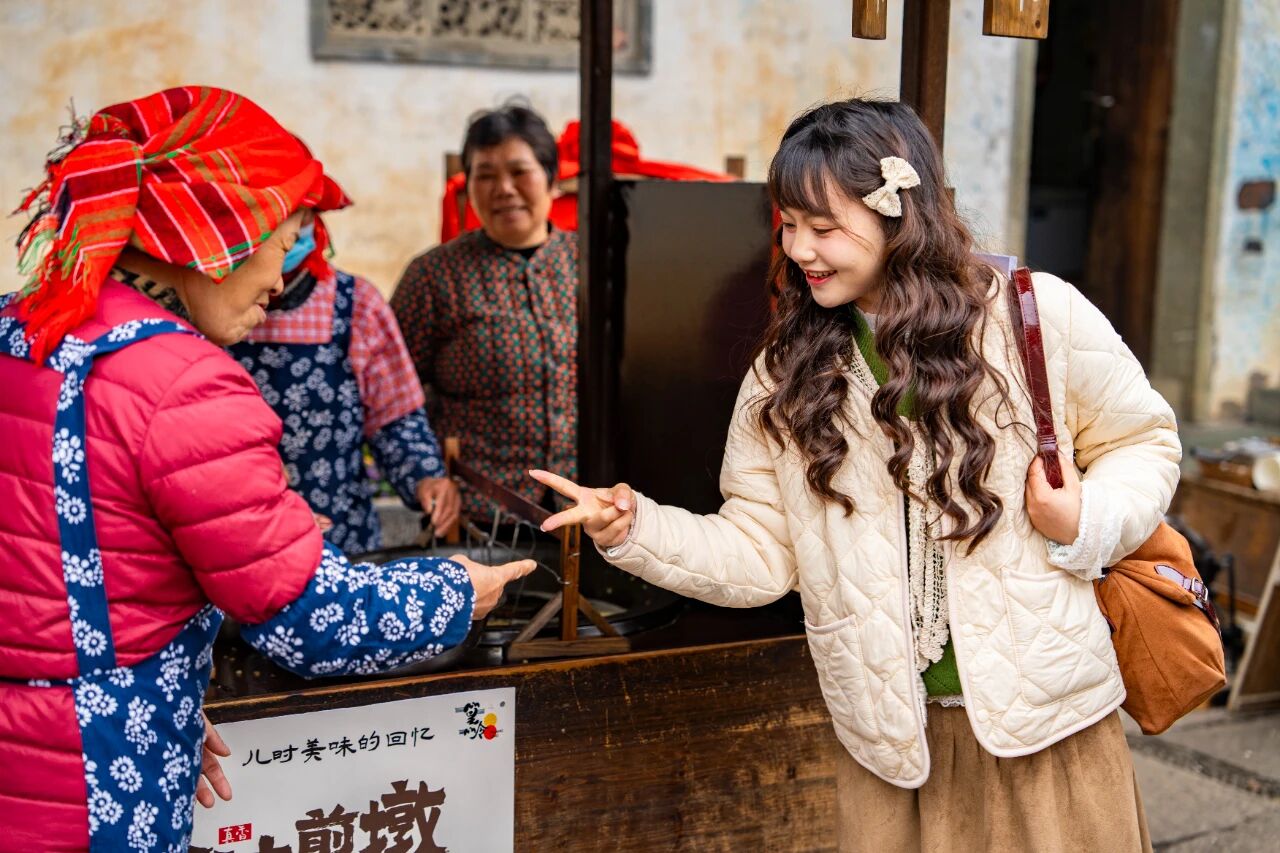 每一处互动都藏着惊喜,凭赢来的粮票,能兑换炒米片、卤鸡蛋、汽糕、油煎墩等婺源民俗小吃,吃不完的粮票还能收藏留念,把旧时光揣进兜里。