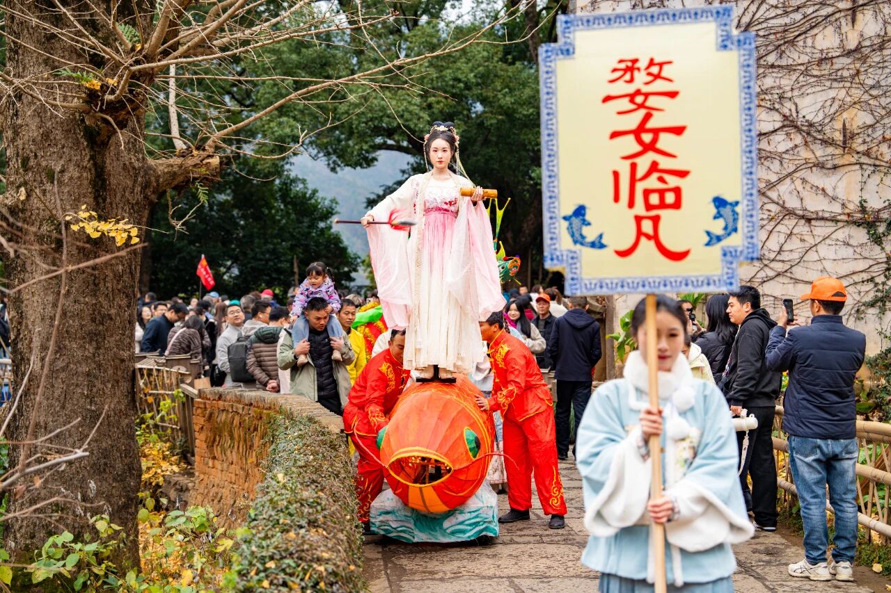 后,《婺女临凡》灯彩巡游惊艳登场!祠堂广场列阵启福后,巡游队伍缓缓行至众屋广场。大家接过“赐福使者”送上的福安帖书签,在鳌鱼、鲤鱼等灯彩的环绕中,收下这份来自婺女之源的专属福气。