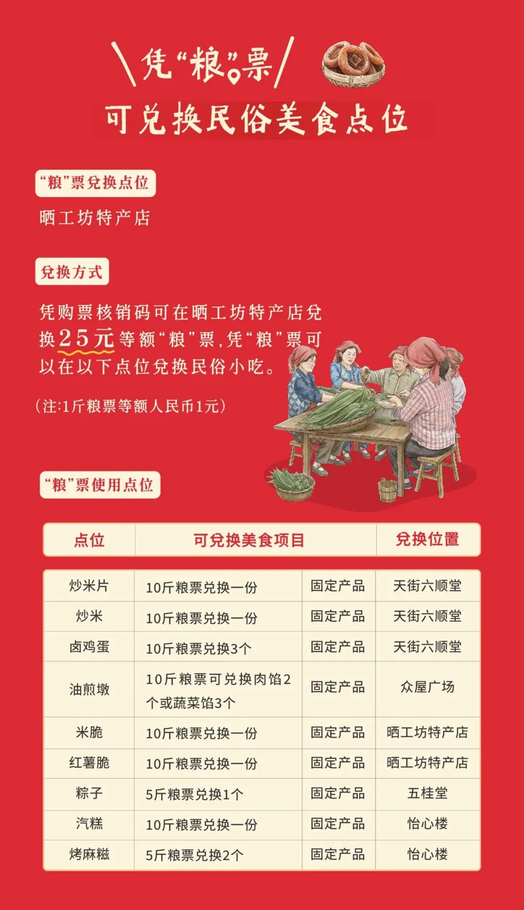三、可去晒工坊特产店换成25元等额的“粮票”,换炒米片、卤鸡蛋、汽糕这些民俗小吃。