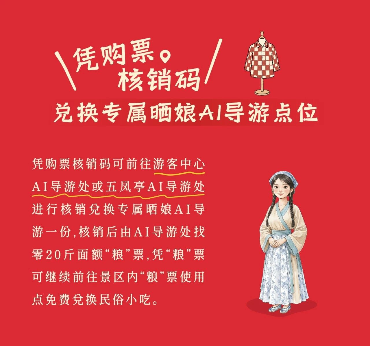 四、可去游客中心AI导游处或者五凤亭AI导游处核销,换一份专属的晒娘AI导游服务,核销后会找零20元等额的粮票,拿着这些粮票照样能去景区里的粮票使用点免费换民俗小吃。