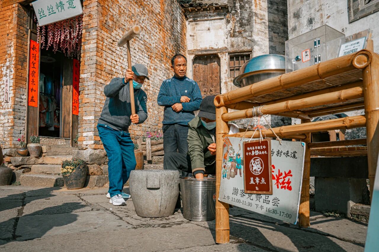 旁边的手工麻糍摊前,大哥早已备好石臼和木槌,花5斤粮票就能亲自上阵体验打麻糍,捶得糯米黏糊糊、香喷喷,完成后还能带走一份自己做的麻糍。