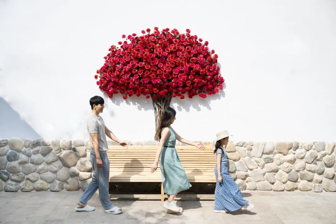 身着徽派服饰的NPC遍布古村和花海,花神使者、牛郎织女、卖花郎等等,与他们互动回答问题,可以获得粮票兑换美食与礼物,在轻松愉快的相处中,加深对徽派文化的了解,让亲子时光更具趣味性。