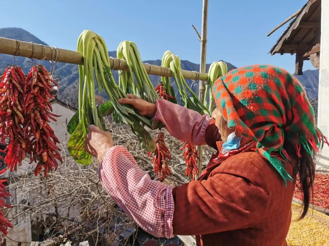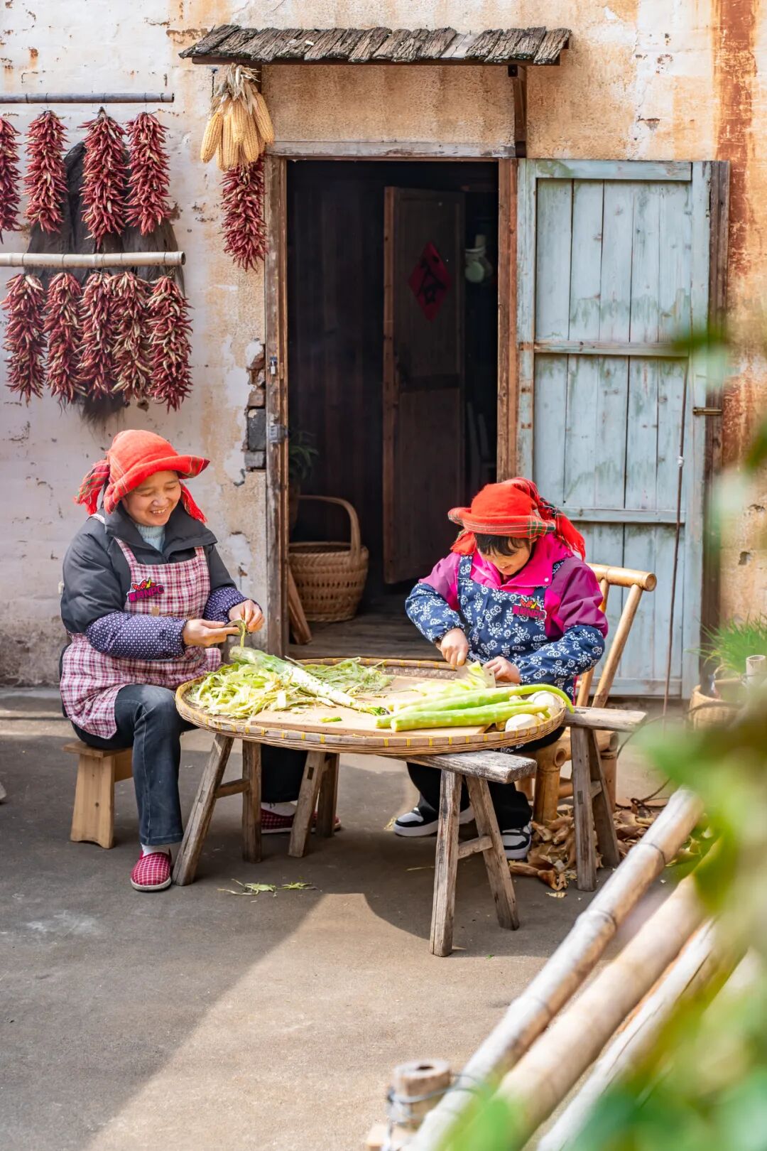 在篁岭过春天,最不能错过的,是把春天吃进嘴里的幸福感。这里的春天,是晒在竹匾里的。不同于秋日的五谷丰登,四月的晒秋场上,铺满了刚从山里采来的春笋、山蕨、青菜等,阳光把春日的鲜气一点点锁进食材里,也晒出了独属于篁岭的春日斑斓